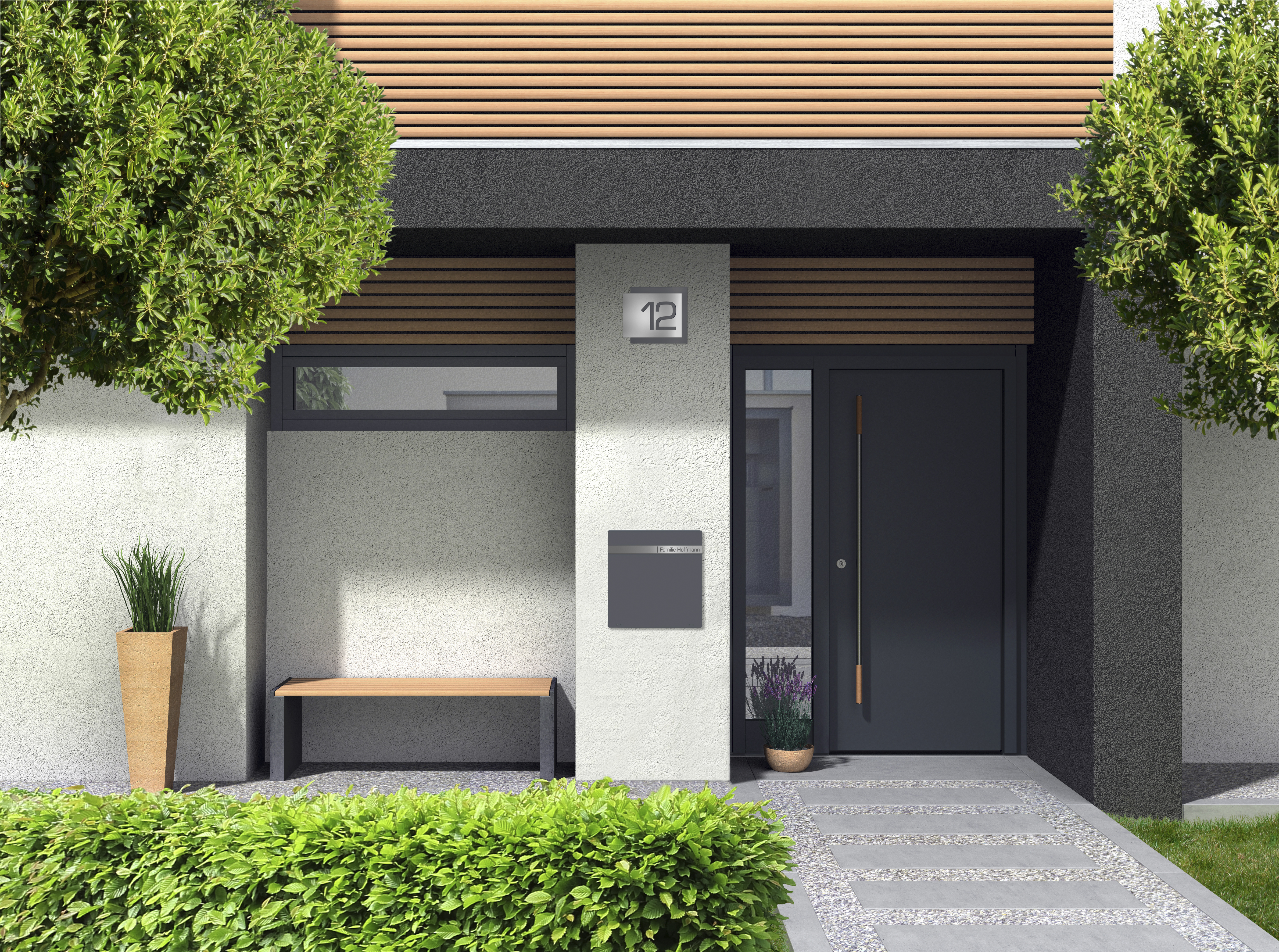 Das Hausnummernschild SHAPE harmoniert besonders gut mit den Frabox-Briefkästen.